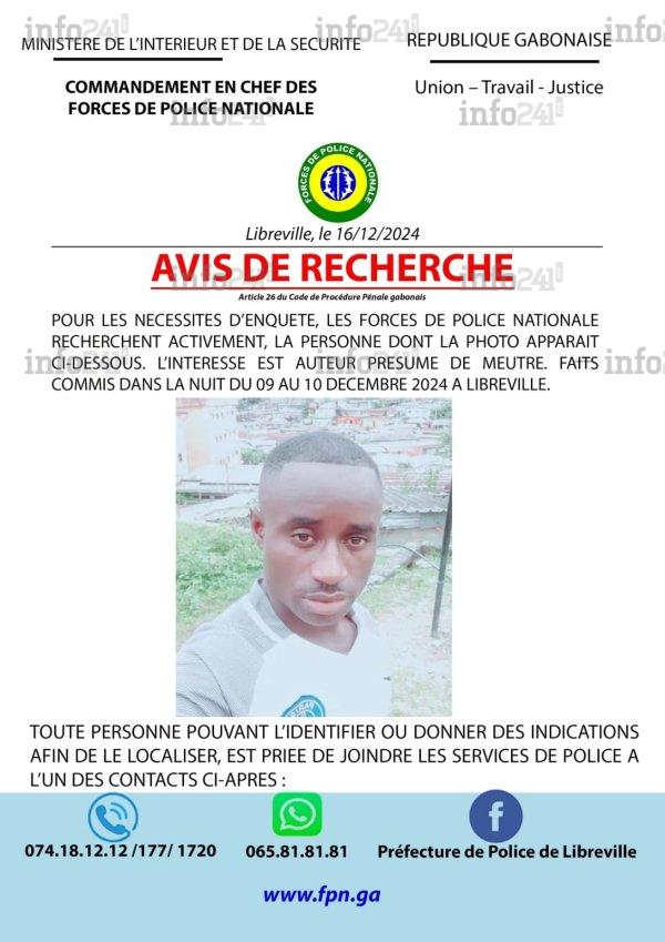 Le Commandement en chef des Forces de police nationale (FPN) a diffusé, lundi 16 décembre, un avis de recherche à l’encontre d’un jeune homme, âgé d’une vingtaine d’années, suspecté de meurtre à Libreville. Ce crime aurait été commis dans la nuit du 9 au 10 décembre 2024, en plein cœur de la capitale gabonaise.