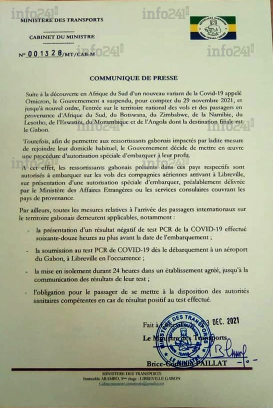 L’information aurait pu passer inaperçu en raison des derniers développement de l’actualité nationale. Le gouvernement gabonais a enfin décidé d’autoriser le retour des gabonais bloqués dans 8 pays d’Afrique australe dont l’Afrique sud en raison de la fermeture des frontières aériennes avec ces pays liée à la menace sanitaire du variant Omicron. Selon un communiqué du ministère des Transports daté du 23 décembre et rendu public le jour de Noël, ces Gabonais peuvent désormais se faire délivrer une « autorisation spéciale d’embarquer » dans le pays de départ pour pouvoir prendre un vol pour le Gabon.
