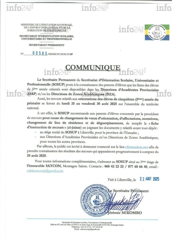 « Le SOSUP recommande aux parents d’élèves concernés (…) de remplir la fiche d’instruction de recours en joignant les documents et justificatifs relatifs », indique la note. Les résultats des recours seront progressivement disponibles en ligne dès le 25 août via le site eformation.net où sont par ailleurs disponibles depuis jeudi les résultats de ces orientations.
