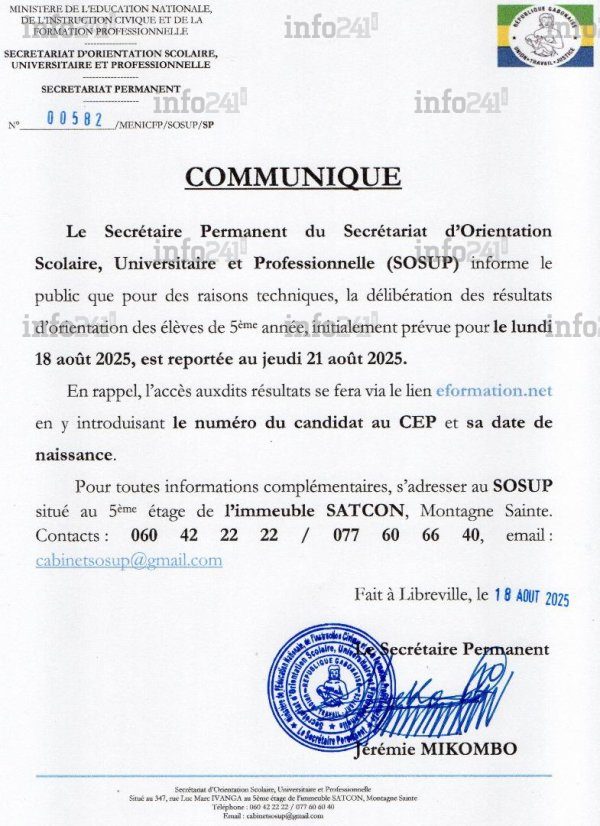 À moins de deux semaines de la rentrée scolaire 2025-2026 au Gabon, les élèves admis au Certificat d’études primaires (CEP) vont devoir patienter encore quelques jours avant de connaître leur affectation en classe de 6e. Prévue initialement ce lundi 18 août, la publication des résultats d’orientation a été reportée au jeudi 21 août, a annoncé le Secrétariat d’orientation scolaire, universitaire et professionnelle (SOSUP) dans un communiqué officiel daté de ce même lundi mais rendu public ce mardi.