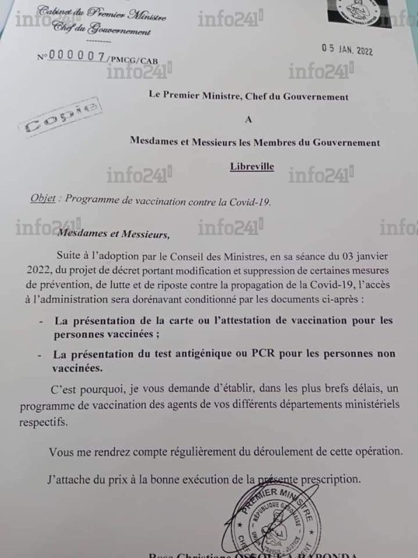Dans son courrier du 5 janvier adressée à son équipe gouvernementale, la Première ministre d’Ali Bongo rappelle que « Suite à l’adoption par le Conseil des ministres, en sa séance du 03 janvier 2022, du projet de décret portant modification et suppression de certaines mesures de prévention, de lutte et de riposte contre la propagation de la Covid-19, l’accès à l’administration sera dorénavant conditionné » par « la présentation de la carte ou l’attestation de vaccination pour les personnes vaccinées » et « la présentation du test antigénique ou PCR pour les personnes non vaccinées ».