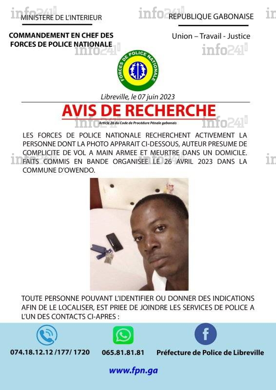 Le principal suspect est un homme âgé de 30 ans. Il est depuis hier activement recherché par la police pour faire toute la lumière sur ce meurtre. « Pour les nécessités d’enquête, les Forces de police nationale recherchent activement la personne dont la photo apparait ci-dessous, auteur présumé de complicité de vol à main armée et meurtre dans un domicile. Faits commis en bande organisée le 26 avril dernier dans la commune d’Owendo », indique la police.