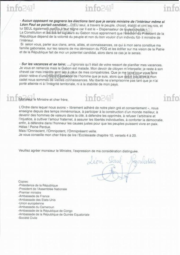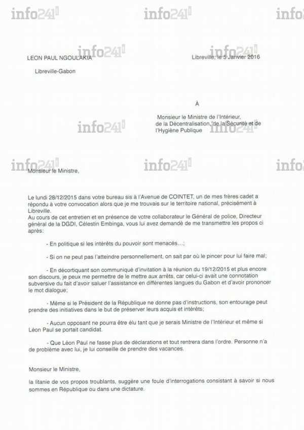 Ce courrier daté du 5 janvier de Léon Paul Ngoulakia adressé au ministre de l’intérieur revient sur les nombreuses mises en gardes formulées à son encontre lors d’une convocation à laquelle était également présent le patron de la Direction générale de la documentation et de l’immigration (DGDI) Célestin Embinga.
