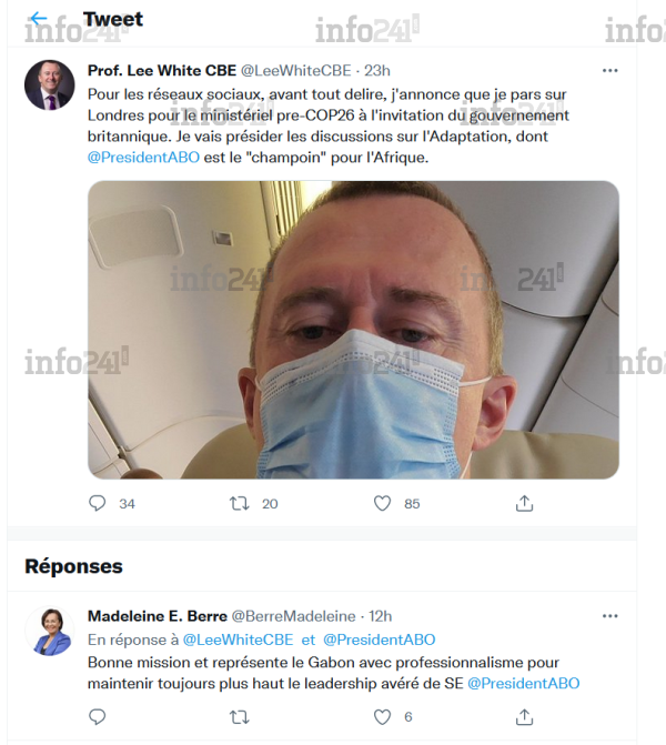« Pour les réseaux sociaux, avant tout delire, j’annonce que je pars sur Londres pour le ministériel pre-COP26 à l’invitation du gouvernement britannique. Je vais présider les discussions sur l’Adaptation, dont Ali Bongo est le »champoin" pour l’Afrique", a-t-il annoncé samedi matin sur twitter accompagné d’une photo de lui à bord d’un avion.