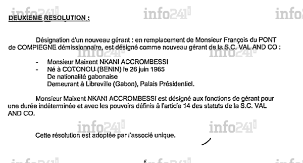 Dans le procès-verbal de l’Assemblée générale extraordinaire de la SCI Val and CO du 21 avril 2010, une résolution actant la cession des parts sociales est prise. Elle révèle que l’associé unique de la SCI des 49 et 51 rue de l’Université à savoir l’Etat gabonais, et cette même SCI détiennent désormais l’intégralité du capital de la SCI Val and Co. Dans la deuxième résolution de la même Assemblée Générale désigne Maixent Accrombessi comme gérant.