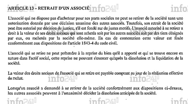 Plus intrigant ce sont les statuts de la SCI Val and Co qui ne manquent pas d’inquiéter s’agissant d’un bien public. L’article 13 dispose sur le retrait d’un associé. Nous le reproduisons ci-dessous in extenso.