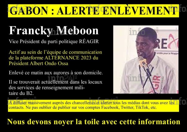 Les autorités gabonaises ont débuté depuis plusieurs jours une série d’arrestation de militants et sympathisants de l’opposition. Une répression qui s’ajoute à la coupure du signal des médias d’informations internationaux tels que RFI ou France24, tous suspectés par le gouvernement sortant de favoriser l’opposition dans leurs programmes. Un climat de terreur qui s’est soldé ces dernières heures par l’arrestation de Francky Meboon, membre de la cellule communication d’Alternance 2023.