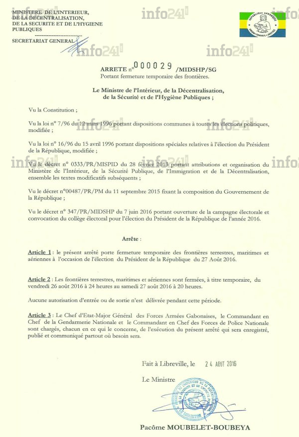 Ainsi donc, les frontières maritimes, terrestres et aériennes seront fermées du vendredi 26 août à minuit au samedi 27 à 20 heures soit une durée totale de 20 heures. Durant cette période, les sorties et les entrées sur le territoire gabonais seront impossibles.