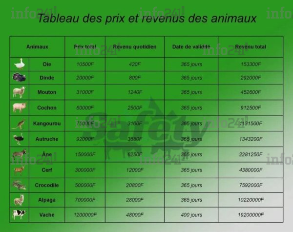 Le « potager » promettait des gains alléchants. Une oie, vendue à 10 500 FCFA, rapportait 420 FCFA par jour, soit 153 300 FCFA au terme du contrat. Un mouton à 31 000 FCFA offrait 1 240 FCFA/jour pour un total de 452 600 FCFA. Le cochon à 60 000 FCFA promettait 2 500 FCFA/jour pour atteindre 912 500 FCFA.