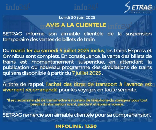 La Société d’exploitation du Transgabonais (SETRAG) a annoncé, dans un communiqué parvenu ce lundi à la rédaction d’Info241, la suspension temporaire des ventes de billets de train du mardi 1er au samedi 5 juillet 2025 inclus. La mesure concerne les trains Express et Omnibus, dont toutes les places sont désormais complètes sur cette période.