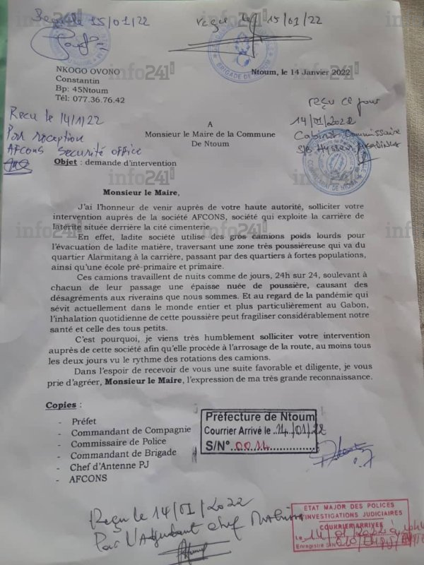 Avant d’ajouter : "Ça n’a jamais été le cas ici. Ni avec Cimgabon, ni avec Afcons actuellement. Nous mangeons poussière. Dormons dedans et respirons que ça. Mieux encore, il y a des écoles et dispensaires aux abords de cette route. Mais c’est un vrai cauchemar aussi bien pour les promoteurs que nous sommes, pour les apprenants et bien entendu pour les personnels. Nous avons donc initiées des démarches. Malheureusement, elles sont lettres mortes. Ce qui peut effectivement renforcer les soupçons d’une connivence entre les autorités locales et les responsables de cette entreprise ».