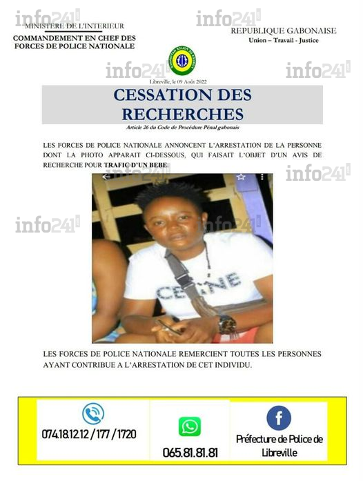 Dans leur avis de recherche, les autorités policières gabonaises indiquaient : « Pour des nécessités d’enquête, les forces de police nationale recherchent activement la personne dont la photo apparaît ci-dessous poursuivie pour trafic d’un bébé ». Cette femme était depuis introuvable d’où l’appel lancé par la préfecture de police à « Toute personne pouvant l’identifier ou donner des indications afin de la localiser ».