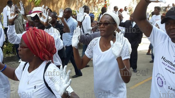 Les militants ont ensuite trempé leurs mains dans des pots de peinture blanche et ont marché en procession sur quelques centaines de mètres le long de la voie rapide de Libreville, levant les mains « en signe de paix » et entonnant des chants religieux.