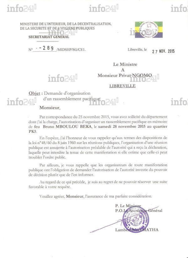On le voit, cette loi gabonaise n’invoque nullement le ministère de l’Intérieur qui s’est pourtant fendu d’interdire ces deux manifestations au nom de l’interprétation qu’il dit faire de l’invocation de cette loi (cf lettre du ministère). A moins bien entendu, que pour le ministère de l’Intérieur, toutes ces sorties pourtant pacifiques et citoyennes constituaient de fait un trouble à l’ordre public.